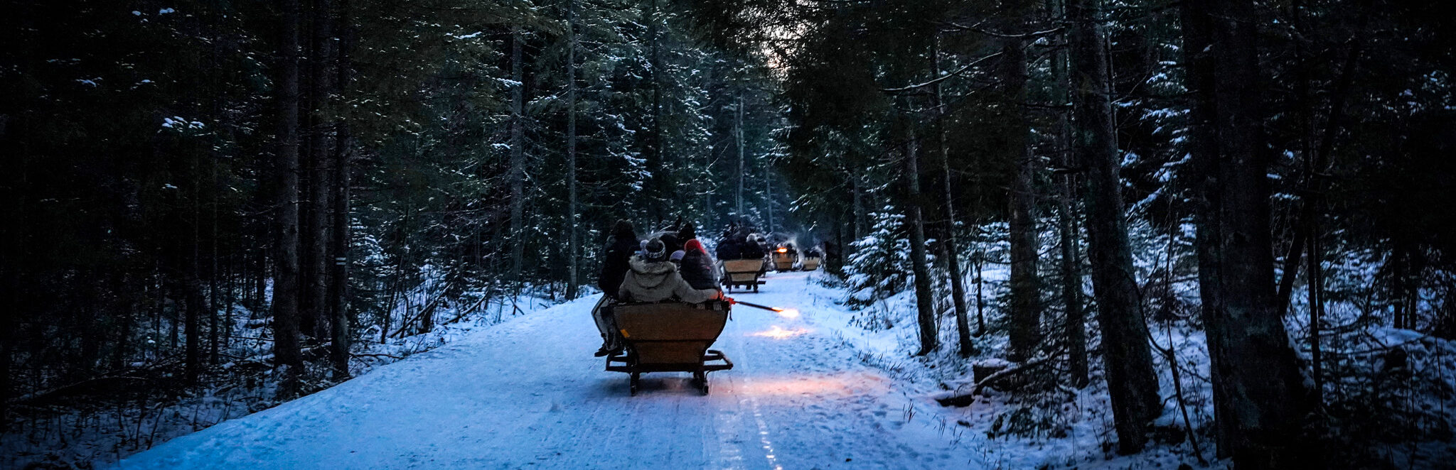 Cisza zimowego wieczoru przerywana jest tylko dźwiękiem dzwonków przy saniach, parskaniem koni oraz trzaskaniem pochodni. To połączenie tworzy niepowtarzalną, relaksującą atmosferę.