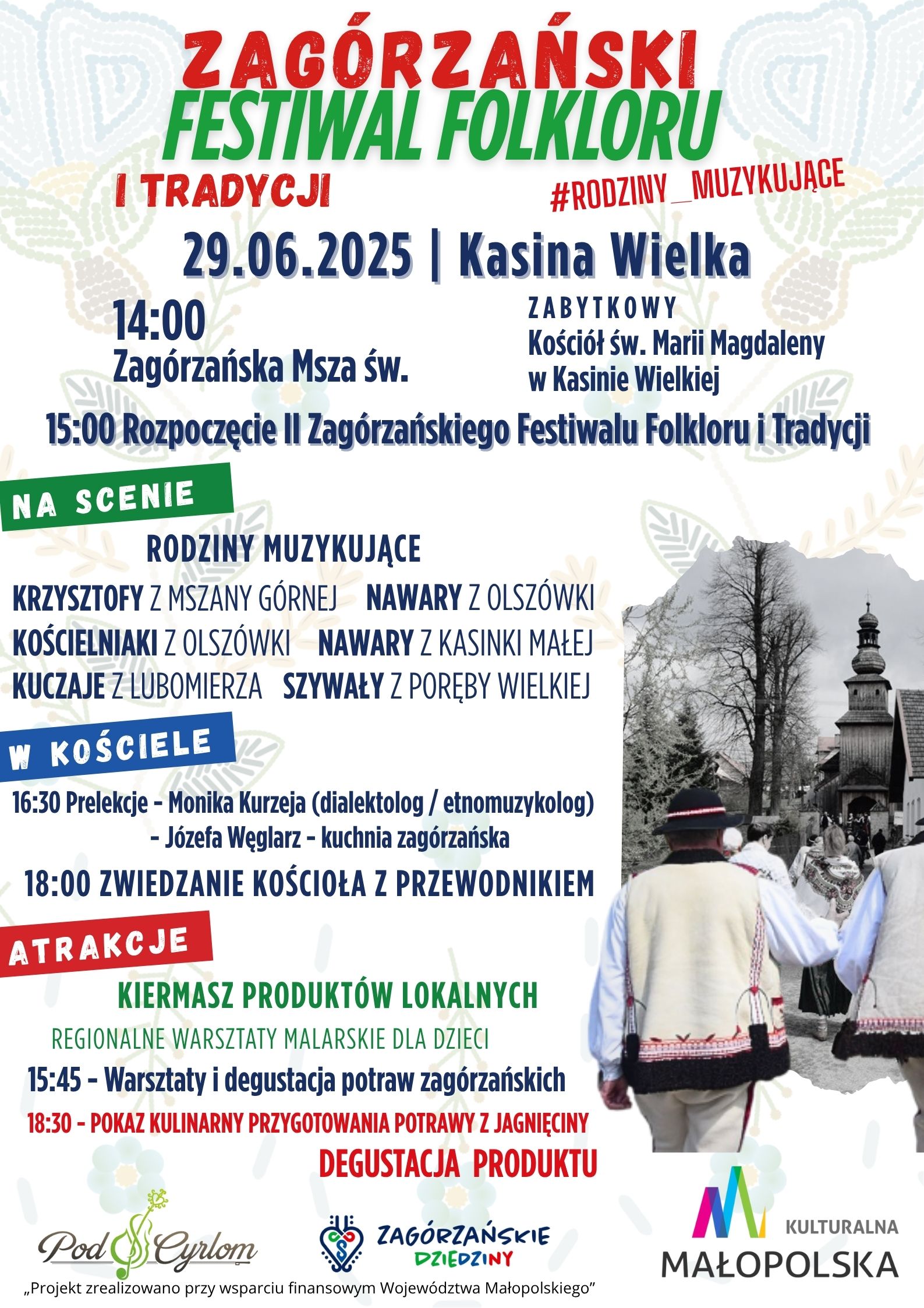 Partnerzy i kreatorzy Zagórzańskich Dziedzin zapraszają na II Zagórzański Festiwal Folkloru i Tradycji #RodzinyMuzykujące, 29 czerwca 2025 r., o godz. 14:00, w Kasinie Wielkiej.