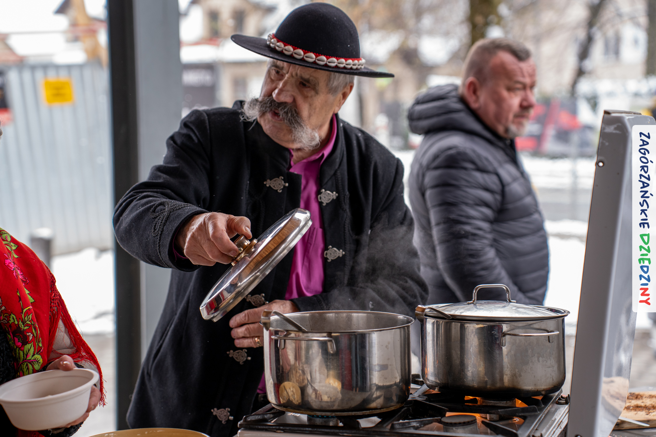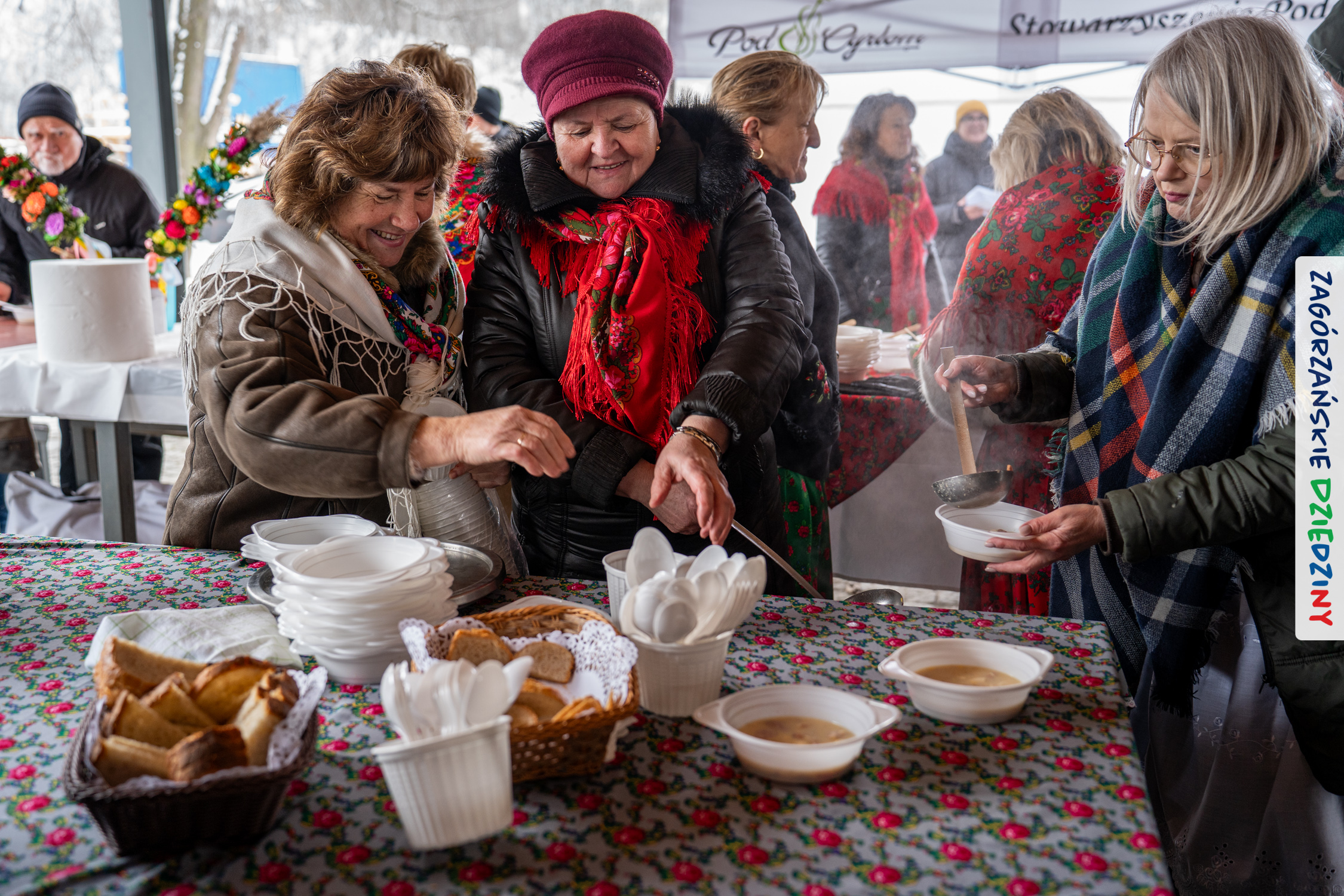 Samo oglądanie tych cudowności mogło zmęczyć, nie mówiąc już o zakupach, bo otoczeni taką ilością pięknych rzeczy mieliśmy nie lada problem z podjęciem decyzji. Na placu targowym, jak na ratunek, zaczęły się pojawiać przedstawicielki kół gospodyń… Był to sygnał, że niebawem będzie można się posilić – rozpoczęły się przygotowania do „Bitwy na sodrę”. Na tą okoliczność specjalnie z Krakowa przyjechał Wojciech Winkel, przyjaciel i sympatyk zagórzańskiej marki lokalnej, a z Rabki – Zdroju – Rafał Wójtowicz, Prezes Oddziału PTTK. Obaj panowie mają wspólne turystyczne plany, o których niebawem napiszemy, jednak w pierwszej kolejności skupiliśmy się na tym, by zarówno naszych gości, jak i wszystkich zabranych poczęstować pięcioma propozycjami sodry. Sodra, czyli zupa ze święconki, to tradycyjna potrawa wielkanocna, nawet w naszej okolicy podawana na różne sposoby: na zimno, na ciepło, gotowana na rosole, z wszystkimi poświęconymi produktami z wielkanocnego koszyczka. Chrzan, jajko, kiełbasa, chleb, ser – to wkładka którą można interpretować kulinarnie na różne sposoby. Takich kulinarnych wariacji w tym daniu szukał Paweł Kołodziej – mistrz gastronomii i szef kuchni „Szapo ba”, który zagwarantował naszym gospodyniom warsztaty kulinarne. Nim doszło do ogłoszenia wyników w bitwie, to zgromadzona publiczność musiała ocenić, która sodra jest najlepsza. Ustawiły się więc długie kolejki do każdego ze zgłoszonych zespołów. Głos należał do degustatorów, a głosowanie, prawie tak ważne jak przy wyborach na Prezydenta, wyłoniło ostatecznie najlepszą zupę.