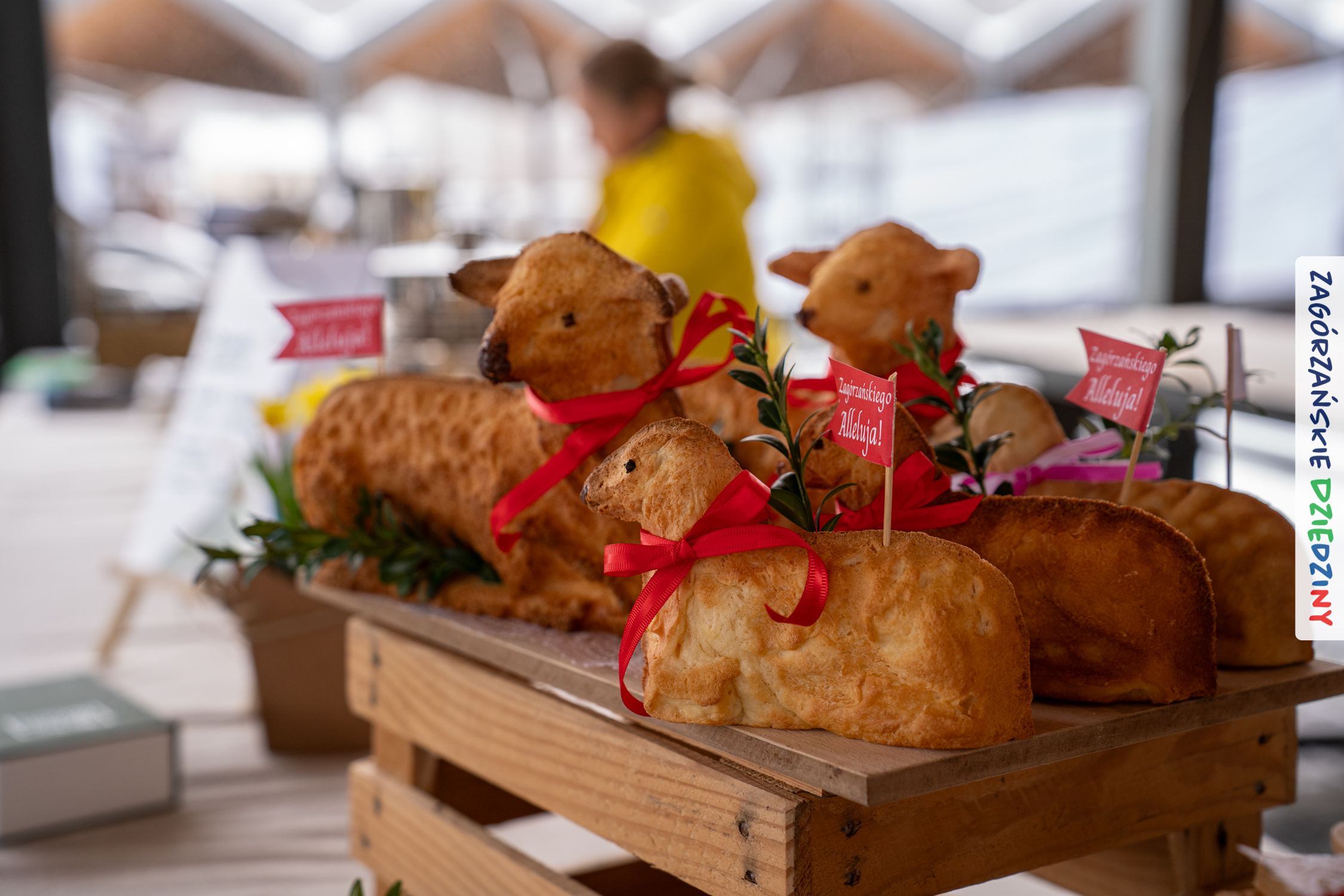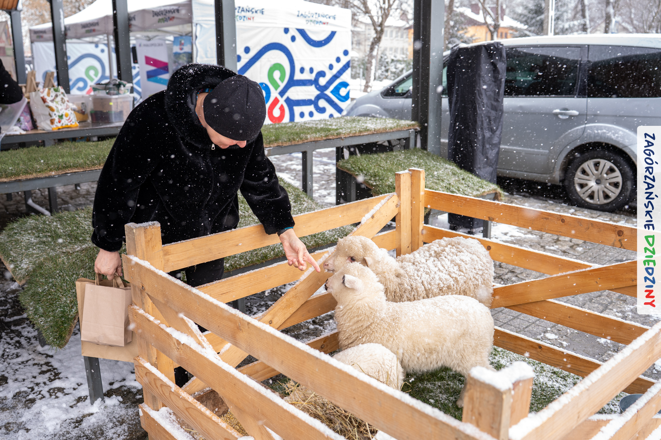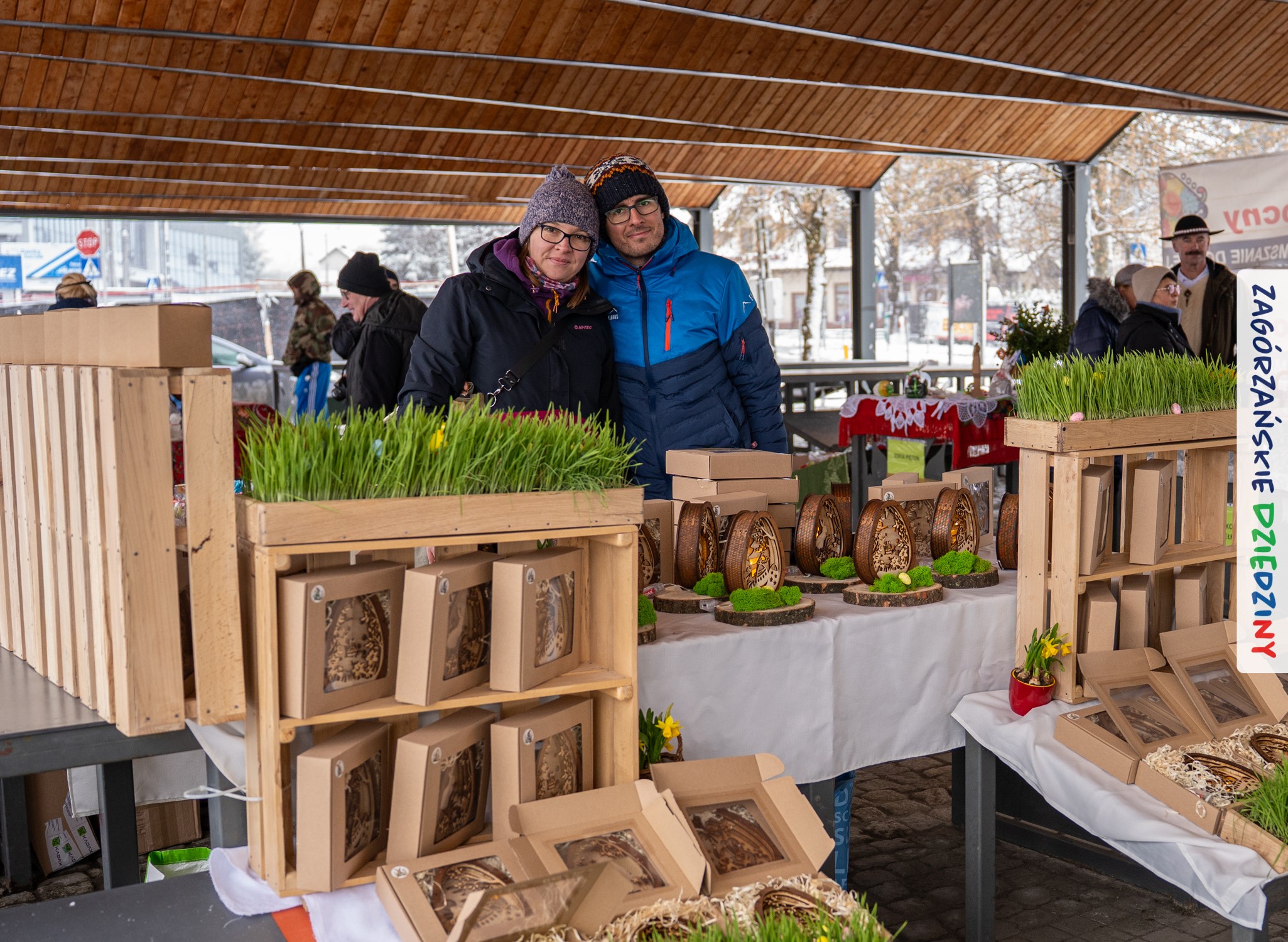 A to dopiero połowa listy! Posiadacze Znaku Promocyjnego Zagórzańskie Dziedziny stanowili mocny zespół, który w tym roku poszerzył się o kolejne nadania. Stoiskiem gastronomicznym z wielkanocnym żurkiem zarządzała rodzina Kościelniaków; to właśnie tam można było zakupić zarówno produkowany w mszańskiej octowni zagórzański żurek i ocet, ale także drożdżowe barany i kolorowe mazurki. Co więcej, nasza licencjonowana Baca w spódnicy, czyli Monika Kościelniak, przywiozła ze sobą swoje najmłodsze pociechy – młode baranki, wśród których serce skradł najmniejszy, Maniek. Wokół ich niewielkiej zagrody zrobiło się zielono i soczyście – to dzięki współpracy z firmą „Lux trawka” mieliśmy możliwość doświadczyć zielonego trawnika w ten śnieżny dzień. Miody od Moniki i Piotra Woźniaków dzięki wielu nagrodom mają swoich nabywców, a do tego sery od Moniki Kubik pasują jak ulał! Co więcej, na tym stoisku zawsze zaskoczy nas jakaś nowość! Tym razem były to serowe paluchy w różnych smakach. Widzieliście wielkanocne propozycje pierników od Gosi Suder? Aż żal będzie je zjeść, tak cieszą oko i zachwycają! Miodu u nas dostatek, wszak drugim, zagórzańskim, dostawcą tego produktu jest Józef Bierowiec, który również pojawił się na jarmarku dotrzymując towarzystwa naszej szydełkowej królowej, Zosi Piętoń. Ślinka ciekła jeszcze bardziej, gdy docieraliśmy na stoisko Moniki Kołodziej vel Cukiernia Babeczka. Ona miała świąteczną ofertę przeróżnych wypieków, wszystko w wielkanocnej aranżacji! Zawsze uśmiechnięta i radosna, Stanisława Blacharczyk, z równie sympatycznym mężem – Janem, na jarmark przywiozła barany – drożdżowe! i te „gołe” i te ubrane w biały, bezowy kożuszek, szybko znalazły nowych właścicieli. Nasze artystki – specjalistki od misternej i dokładnej pracy również mogły zaprezentować swój kunszt. Każdy Drzewniany łobrozek Józi Potaczek, to dopracowana w każdym detalu piękna, uduchowiona twórczość, a Sznurkowe Perełki – koszyczki do święcenia, czapeczki na jajka, okazjonalne dekoracje, pudełka czy zabawki – wszystko to szydełkowa robota. Nie mogło też zabraknąć palm wielkanocnych wykonanych przez Marię Bolisęgę, jak i produktów „Nie z Galerii” oraz dzieł Gabrysi vel Elondi. To właśnie one poszerzyły nasze „markowe grono”. Dziewczyny z Węglówki przywiozły ze sobą sporą ilość przeróżnego rękodzieła, ale nam wzrok uciekał w stronę fantastycznych, turystycznych poduszek. Cieszymy się ogromnie, że zawsze jest z nami Paulina Hanula z całym swoim asortymentem zawierającym się w rodzinnej nazwie firmy „Hafthan Konina”. Poza wszelką regionalną konfekcją i galanterią skórzaną polecamy ciepłe skarpety, które uratowały niejedne zimne nóżki w ten dzień. Na koniec zostawiamy sobie opis stoiska, które wyjątkowo nas urzekło, a należało do naszych przyjaciół, Karoliny i Filipa z „Pora na wycieczkę”. Okazuje się, że ta para ma talent nie tylko do turystycznych wypraw, ale całkiem nieźle radzą sobie w dekoracjach. Drewniana sklejka, naturalny materiał z pięknym świątecznym wzorem, zapakowany w pudełko, zachwycał swoją prostotą, a dodatkowo świecił i przepięknie wyglądał na drewnianej paterze z zielonym mchem chrobotkiem między dekoracją z wysianego owsa.