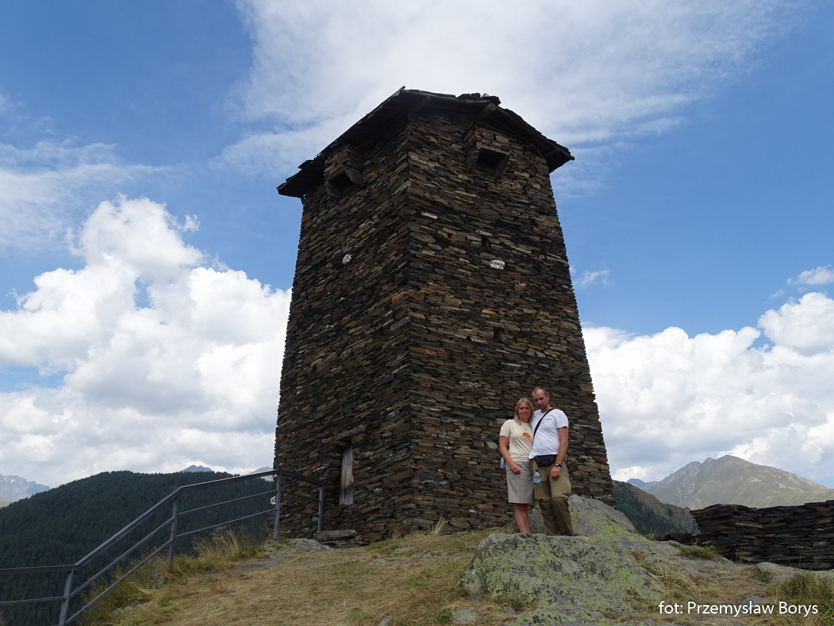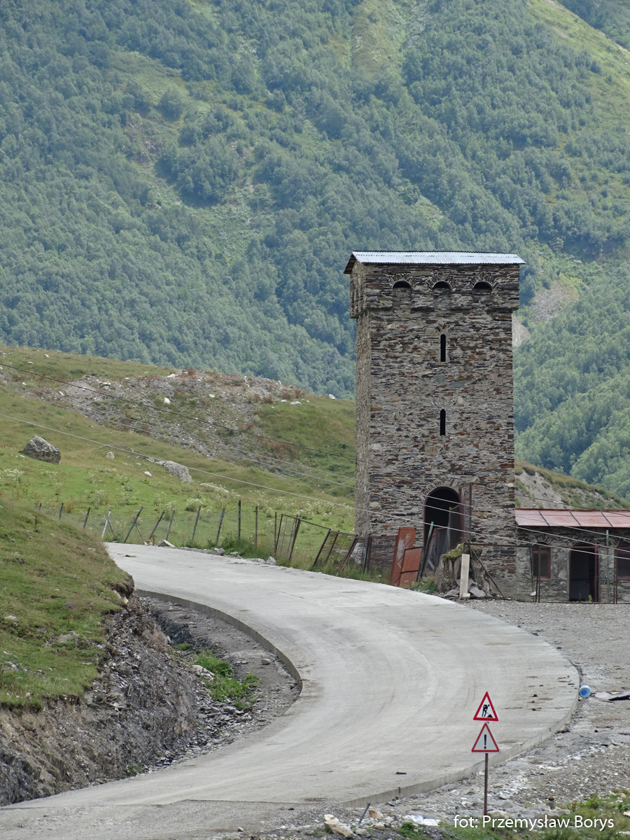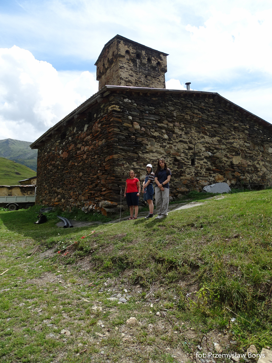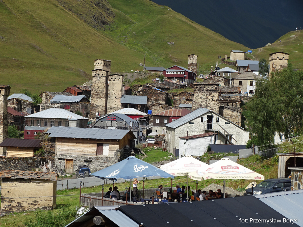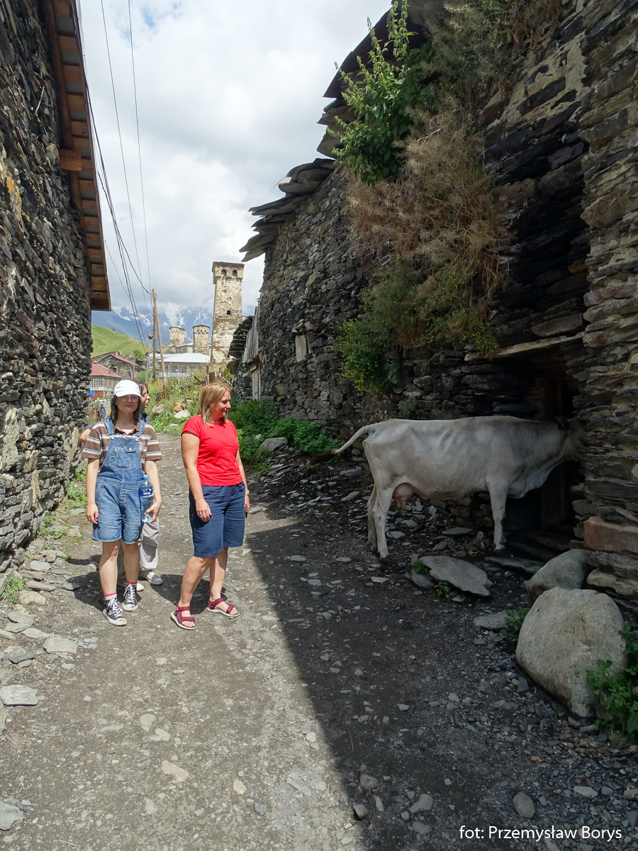 Do Uszguli dojechaliśmy w południe. Zaparkowaliśmy przy drodze za mostem ponad barem Enguri (właściwie – mogliśmy skorzystać z parkingu lokalu, bo ostatecznie tam zjedliśmy obiad – ceny jak w całej Gruzji – przystępne dla Polaków, podobne lub niższe niż w Polsce). Na początek zrobiliśmy krótki spacerek do kościoła Lamaria (Marii) z XII w. (jak na Gruzję to nie taki znów stary) z widokiem na lodowiec Szchary (5193 m n.p.m.) – najwyższej góry Gruzji oraz z wspaniałym widokiem na wieże Uszguli. Przy samym kościółku znajduje się jedna z wież mieszkalnych mor wraz z domem khor – niestety akurat w godzinach, w jakich tam byliśmy nie udało się wejść do środka. Kolejny taki kompleks znajduje się kilkadziesiąt metrów dalej, ścieżką na zachód.