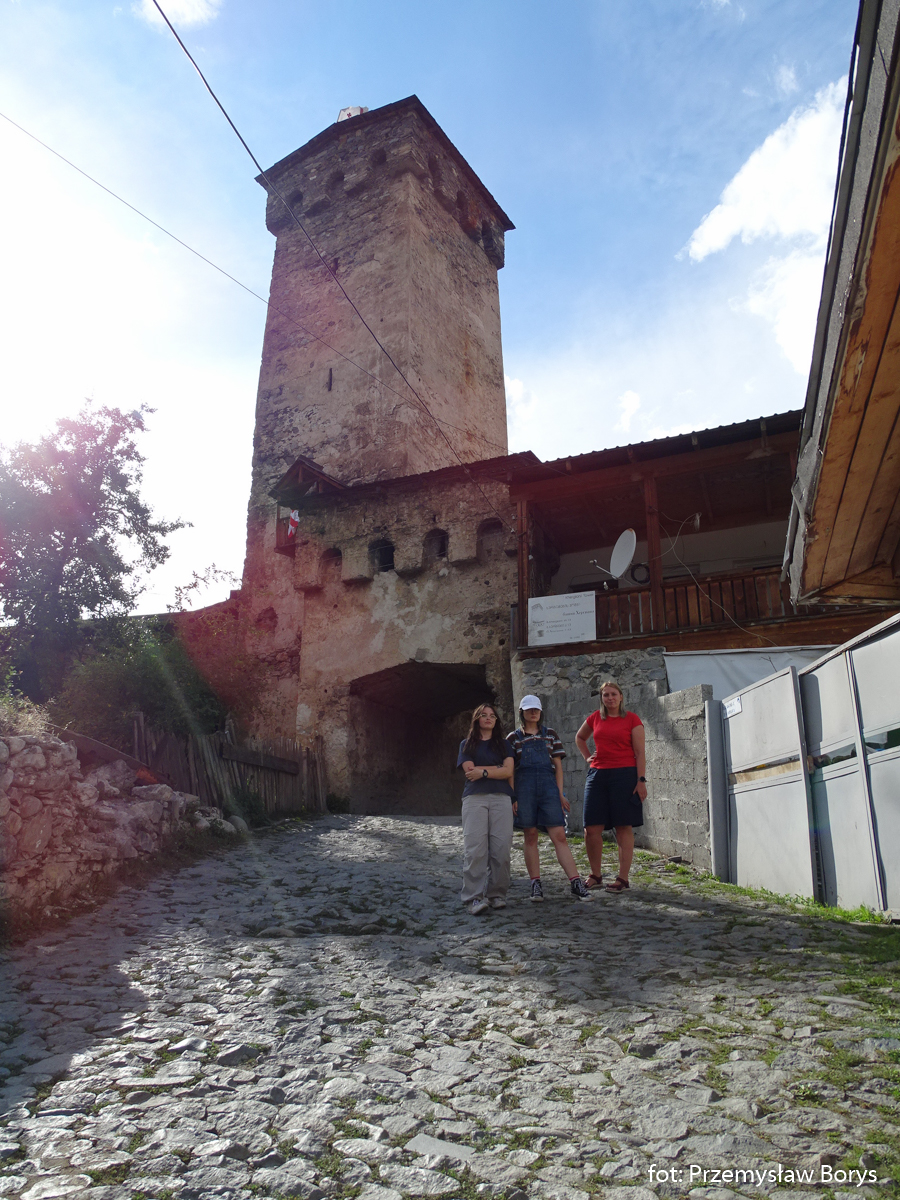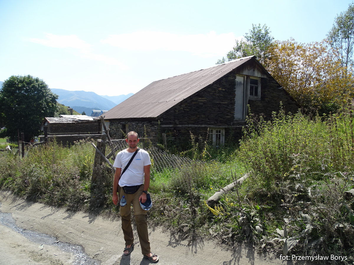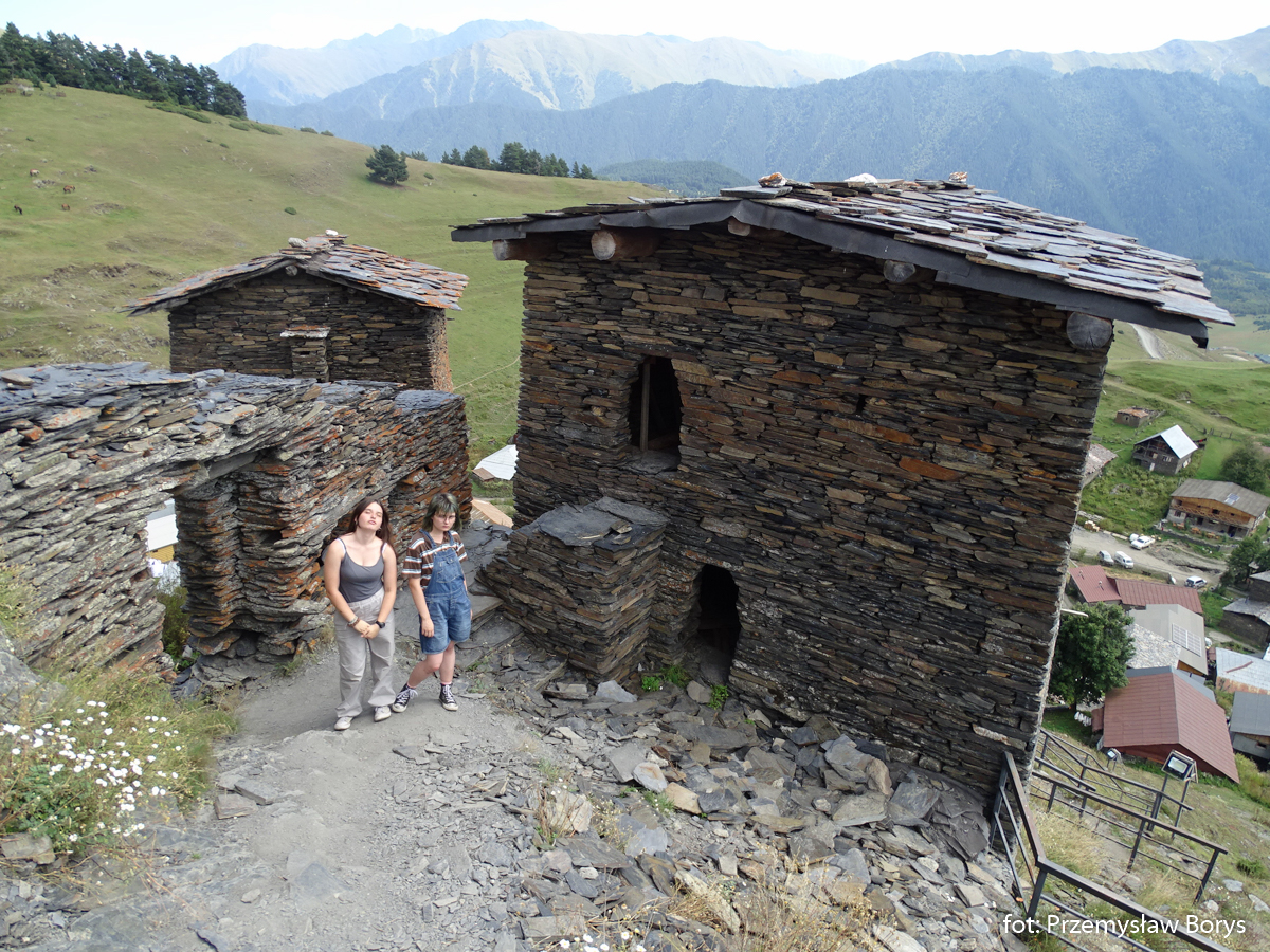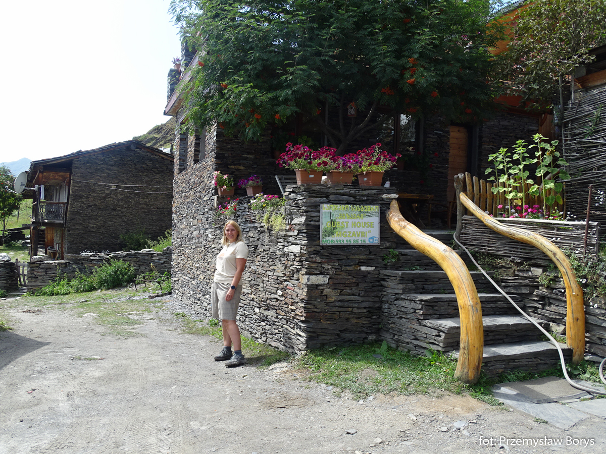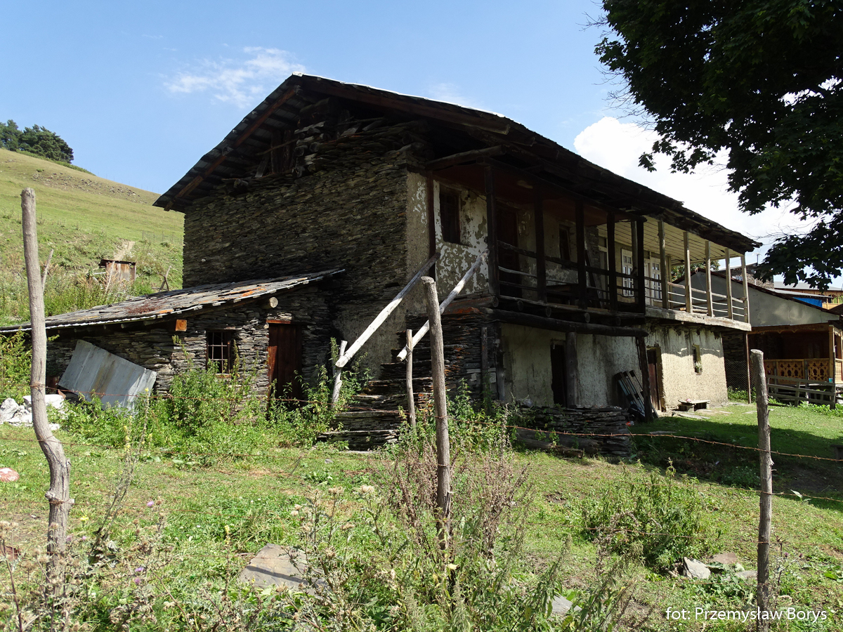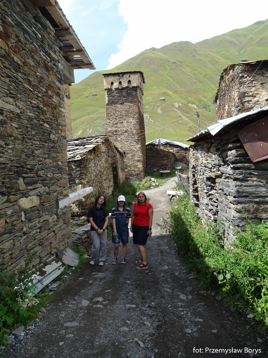 Do Uszguli dojechaliśmy w południe. Zaparkowaliśmy przy drodze za mostem ponad barem Enguri (właściwie – mogliśmy skorzystać z parkingu lokalu, bo ostatecznie tam zjedliśmy obiad – ceny jak w całej Gruzji – przystępne dla Polaków, podobne lub niższe niż w Polsce). Na początek zrobiliśmy krótki spacerek do kościoła Lamaria (Marii) z XII w. (jak na Gruzję to nie taki znów stary) z widokiem na lodowiec Szchary (5193 m n.p.m.) – najwyższej góry Gruzji oraz z wspaniałym widokiem na wieże Uszguli. Przy samym kościółku znajduje się jedna z wież mieszkalnych mor wraz z domem khor – niestety akurat w godzinach, w jakich tam byliśmy nie udało się wejść do środka. Kolejny taki kompleks znajduje się kilkadziesiąt metrów dalej, ścieżką na zachód.