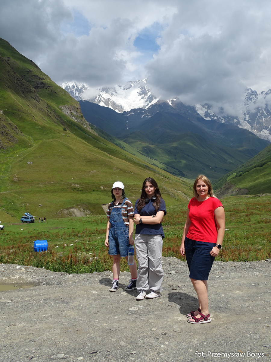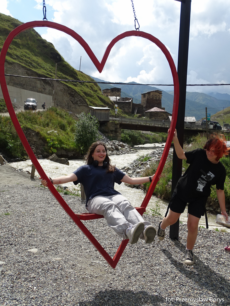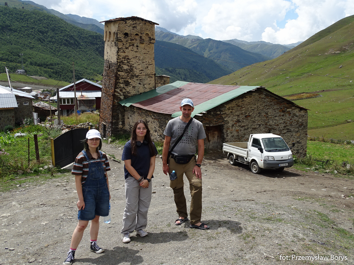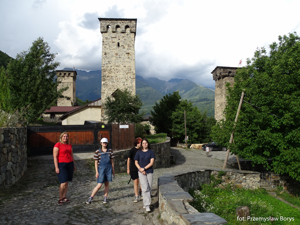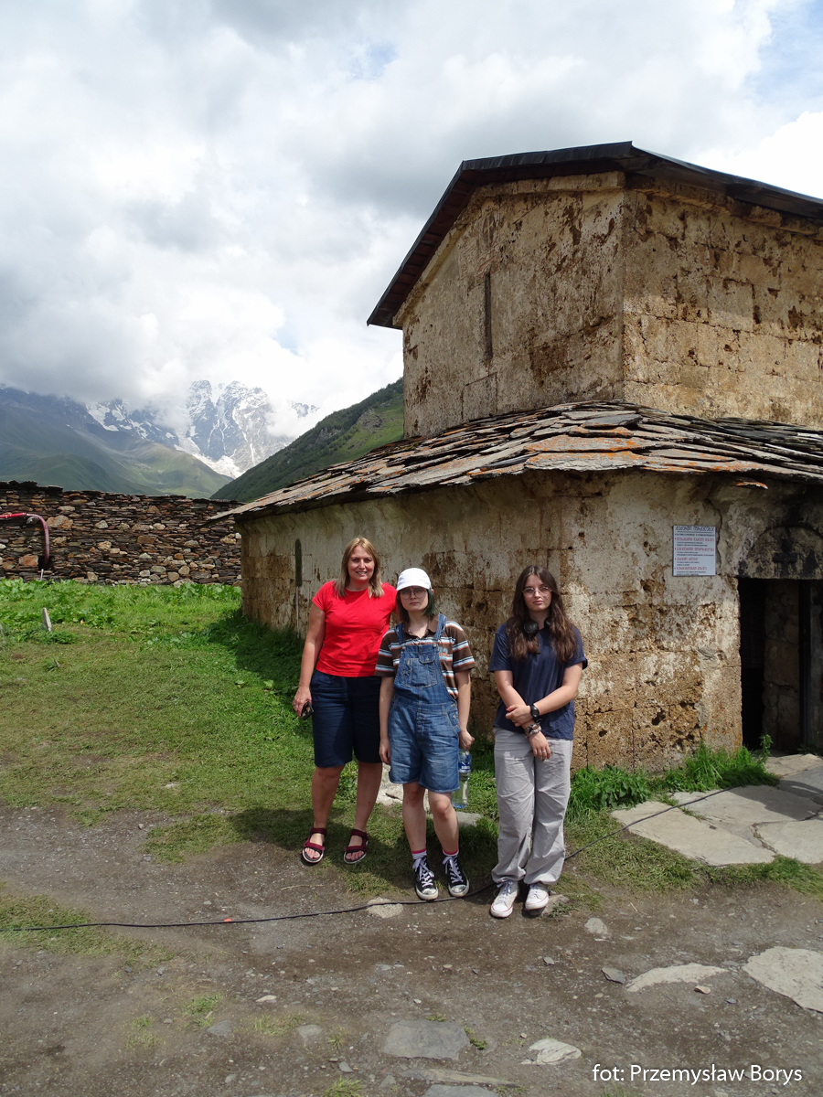 Do Uszguli dojechaliśmy w południe. Zaparkowaliśmy przy drodze za mostem ponad barem Enguri (właściwie – mogliśmy skorzystać z parkingu lokalu, bo ostatecznie tam zjedliśmy obiad – ceny jak w całej Gruzji – przystępne dla Polaków, podobne lub niższe niż w Polsce). Na początek zrobiliśmy krótki spacerek do kościoła Lamaria (Marii) z XII w. (jak na Gruzję to nie taki znów stary) z widokiem na lodowiec Szchary (5193 m n.p.m.) – najwyższej góry Gruzji oraz z wspaniałym widokiem na wieże Uszguli. Przy samym kościółku znajduje się jedna z wież mieszkalnych mor wraz z domem khor – niestety akurat w godzinach, w jakich tam byliśmy nie udało się wejść do środka. Kolejny taki kompleks znajduje się kilkadziesiąt metrów dalej, ścieżką na zachód.
