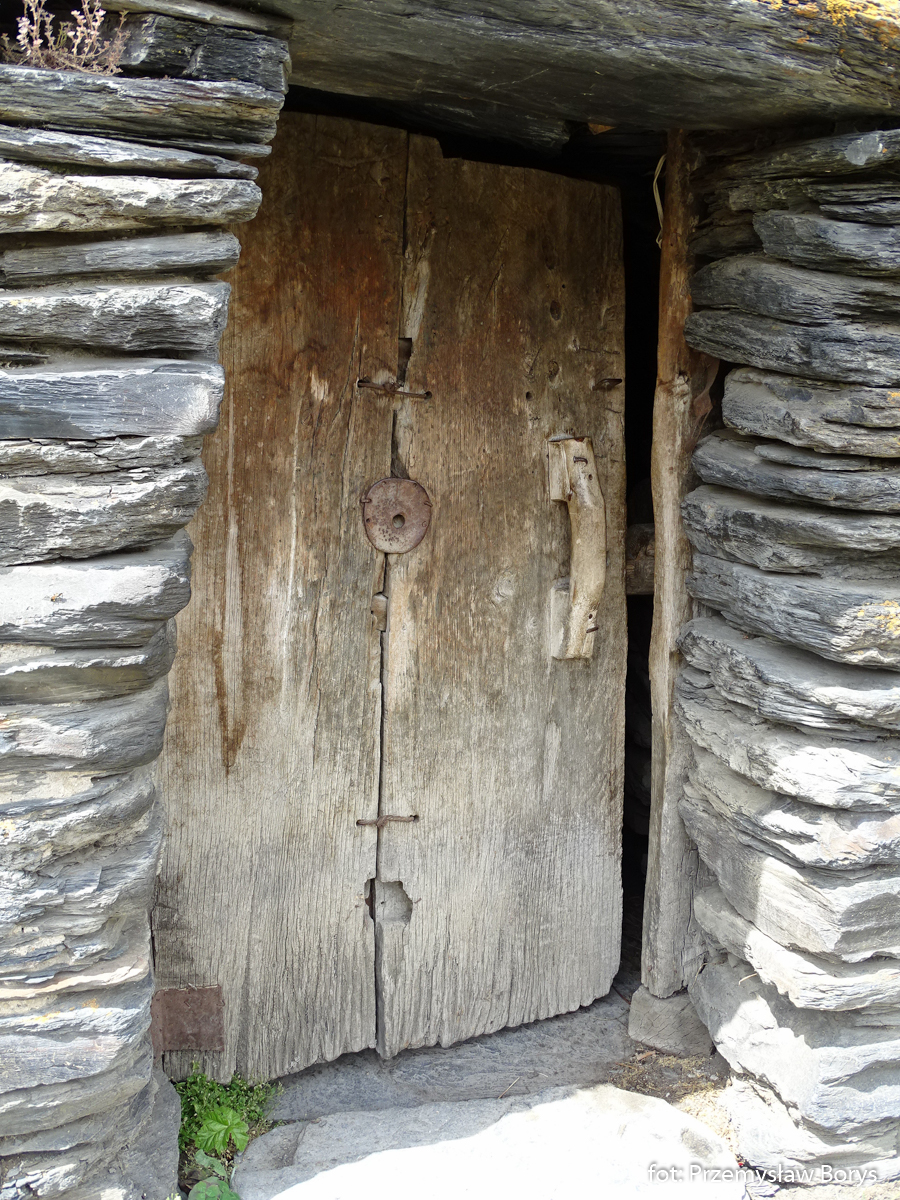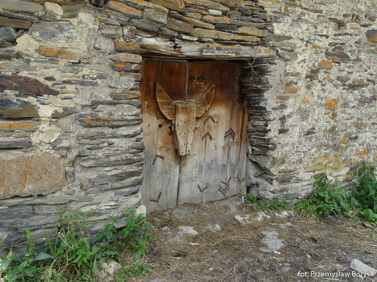 Schodząc ze wzgórza z kościółkiem przeszliśmy przez Uszguli w pobliżu wielu wież mieszkalnych, obserwując różne detale. Np. wykończenie drzwi przy okazji którego można było zaobserwować, że Swanowie w odróżnieniu od mieszkańców Tuszetii, używali zaprawy do łączenia kamieni.