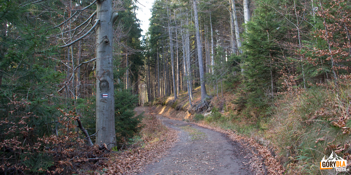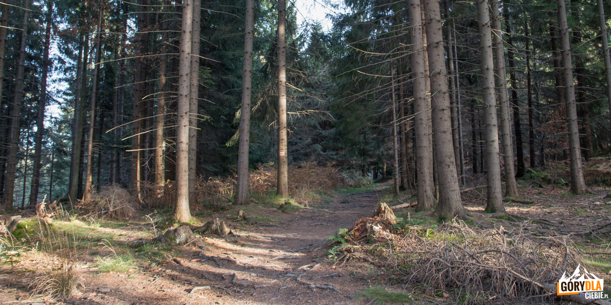 Czerwony szlak prowadzi leśną ścieżką w górę