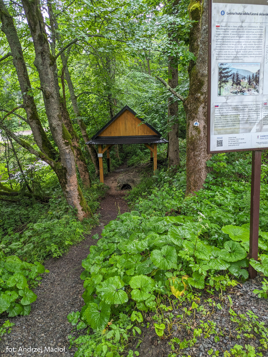 Wodospad w Złatnej Hucie. Od parkingu w górę prowadzi krótka szutrowa droga wzdłuż potoku do miejsca biwakowego i wodospadu. Kaskady wody opadają ze sztucznie wybudowanego progu i spływają uregulowanym dalej fragmentem koryta rzeki. Na brzegu stoi spora wiata turystyczna, ławy i stoły, jest też miejsce na ognisko.